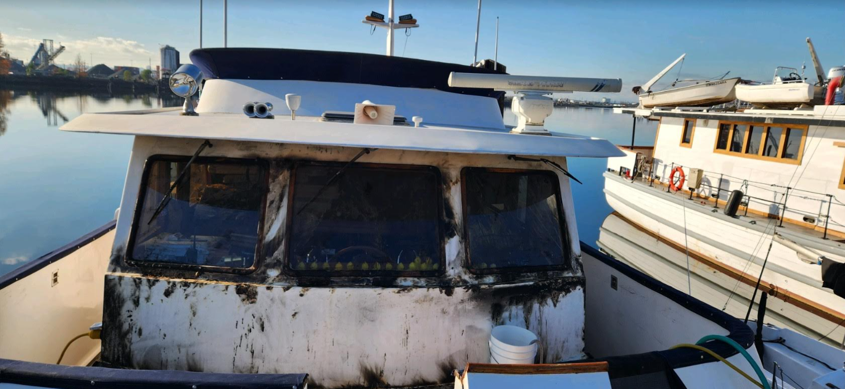 A couple nearby at the South Tacoma Marina noticed something was wrong first. A burning plastic smell drifted through the air. They looked up and saw smoke rising from the pilot house of Dos Mas. By the time they put on their shoes and grabbed a dock hose, flames had fully engulfed the polyester window coverings and the canvas over the bridge bench.